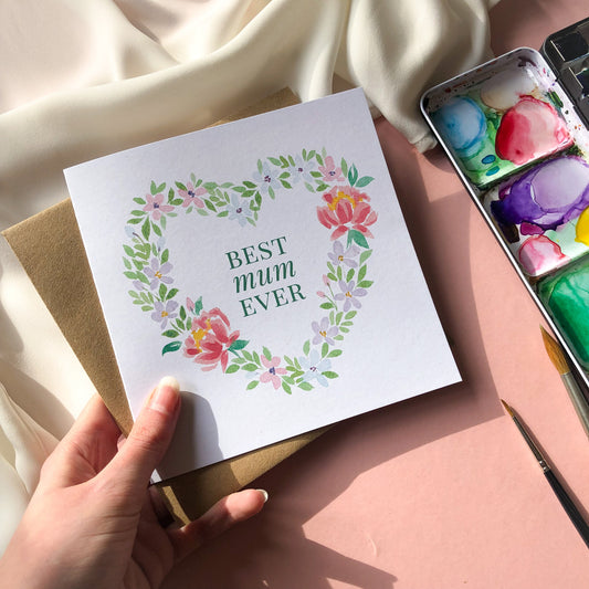 Best Mum Ever Square Card Floral Heart Design