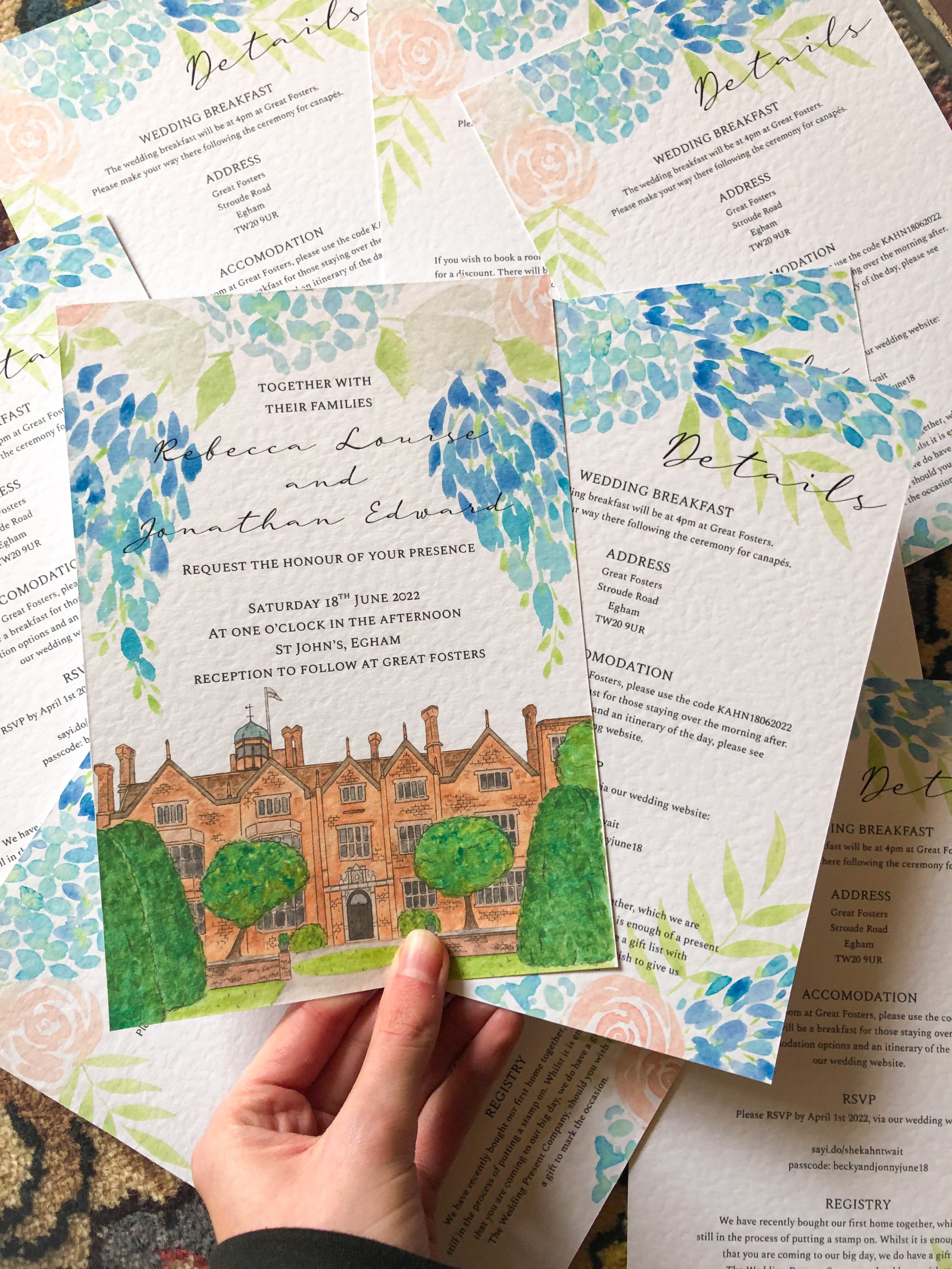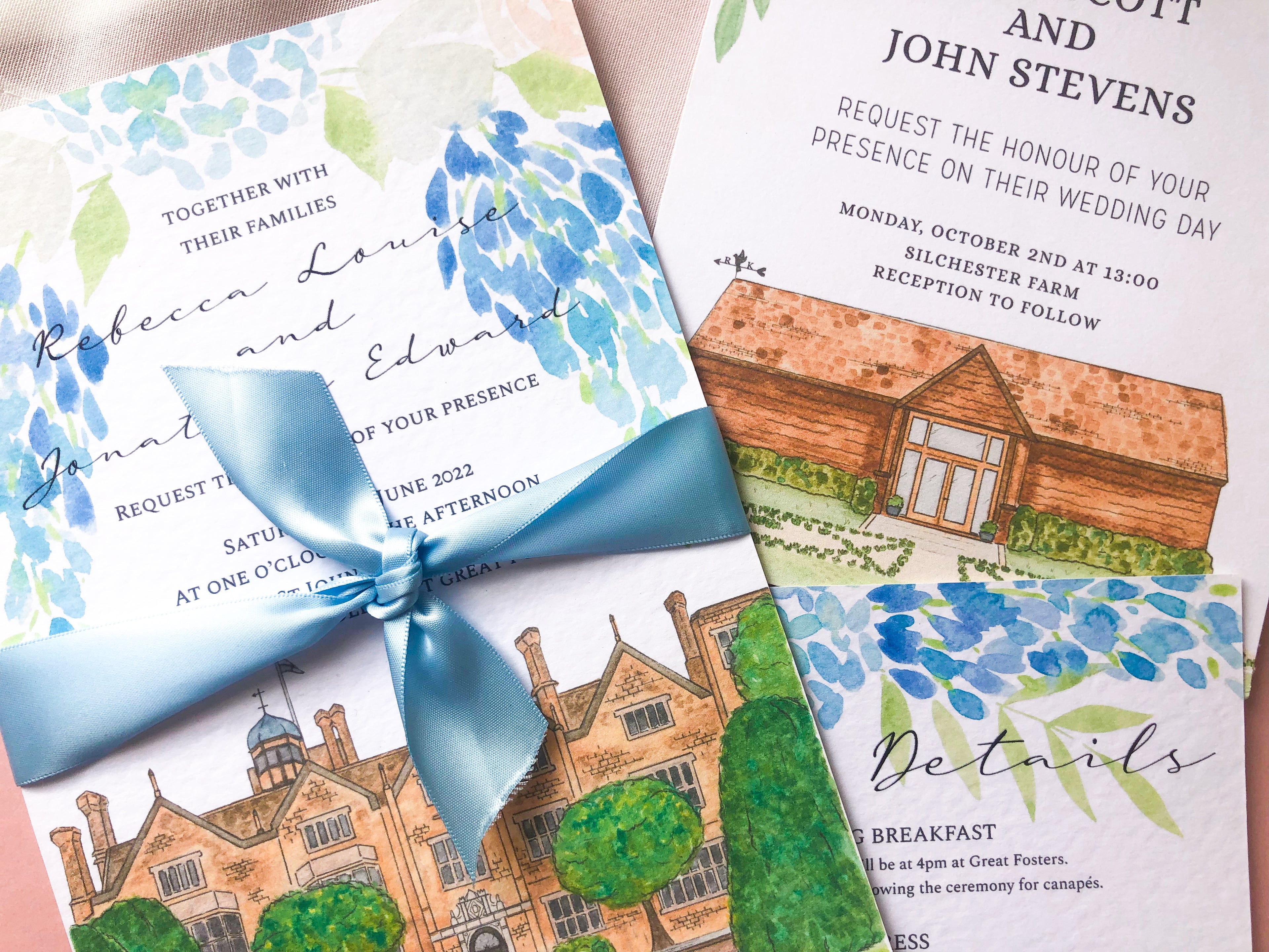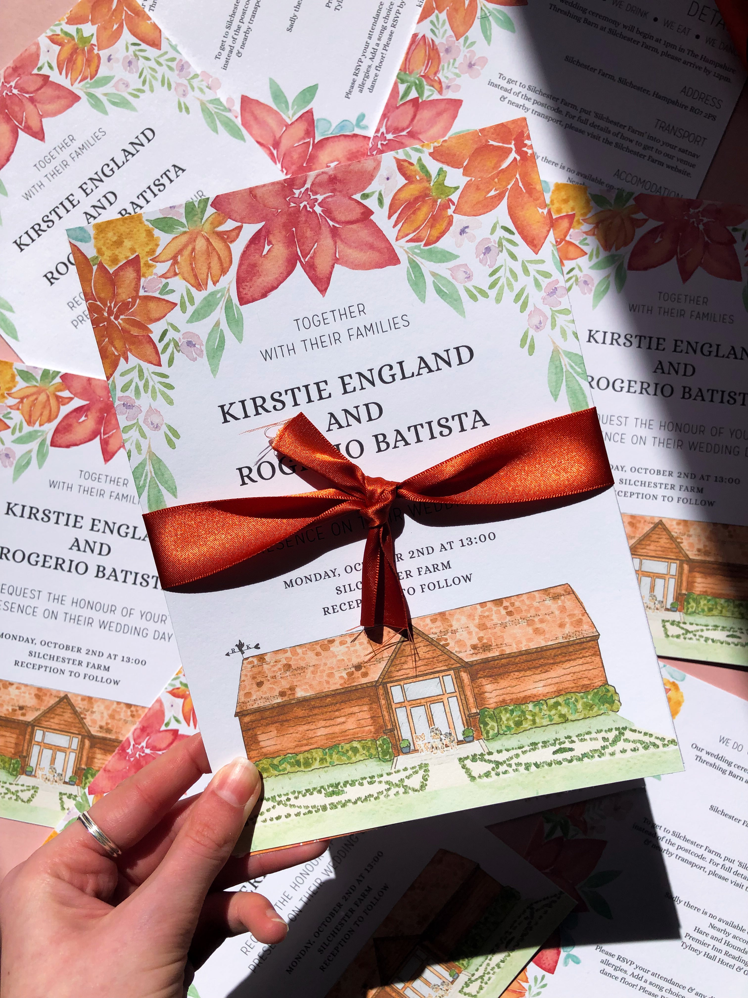 We'll have a consultation call for me to check I've got all the information I need to know. We'll talk colour palettes, design ideas & more. If you decide to go ahead, a deposit will be required to confirm your commission and then I'll put together an initial digital sketch of your design. At this stage, you can make any edits you'd like & you get a feel of what the invitations will look like.