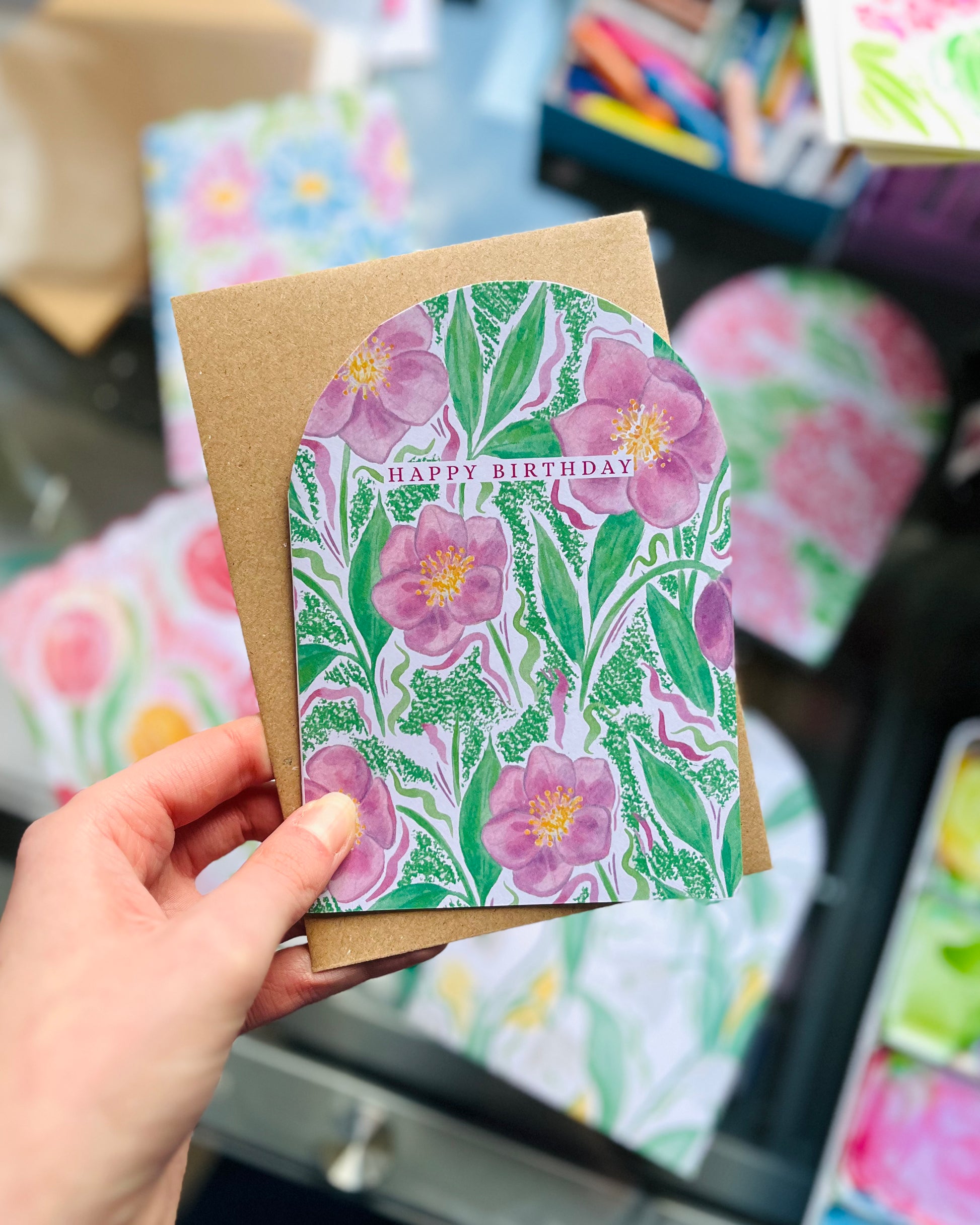 This bold floral birthday card features deep pink-purple hellebores with bright yellow centres, layered with sketchy green oil pastel lines for texture and movement. The mixed media design combines watercolour, ink and oil pastel, giving it a rich, expressive feel while still keeping things playful!